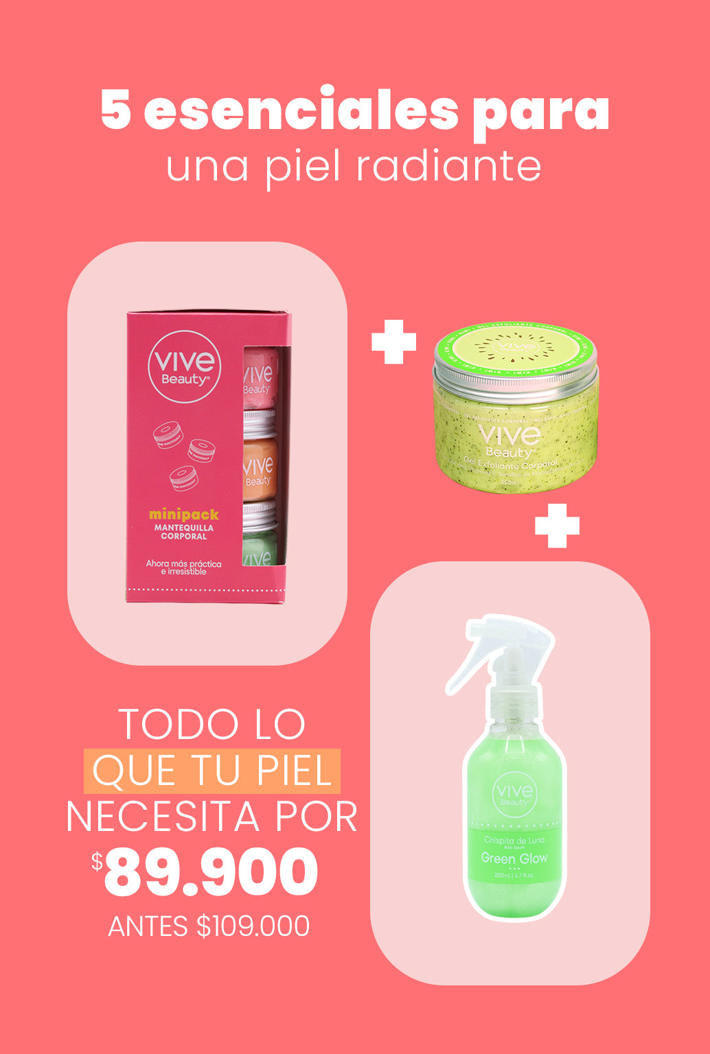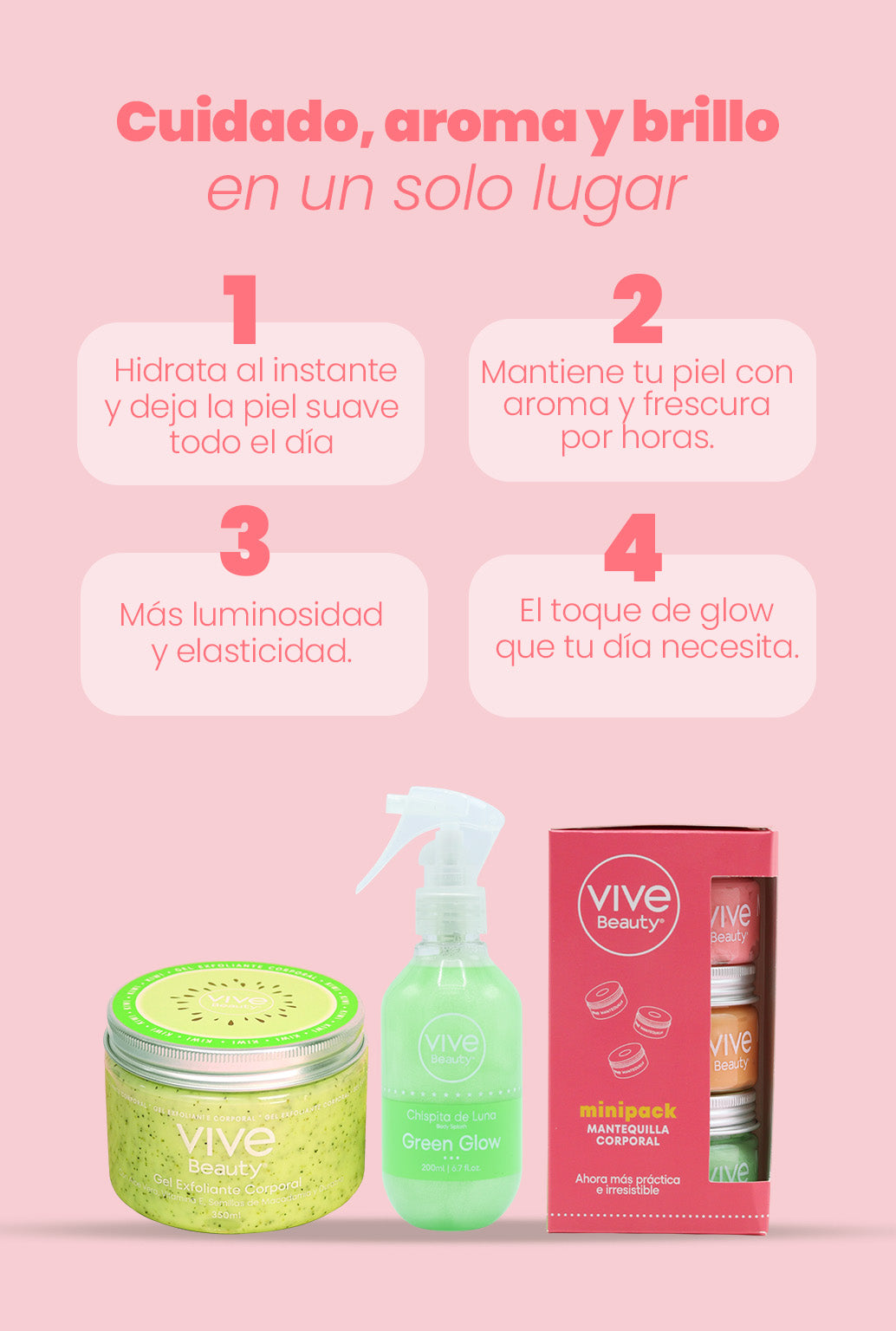 Disfruta este kit irresistible con 5 productos pensados para consentir, hidratar y perfumar tu piel con los aromas favoritos de Vive Beauty. 💕